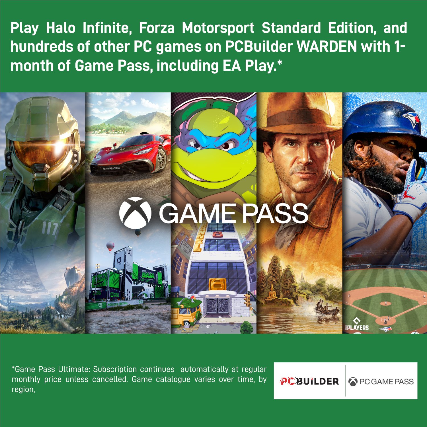 - Play over 100 high-quality PC games like Halo Infinite, Forza Horizon 5 and Teenage Mutant Ninja Turtles: Shredder’s Revenge with your new build and one month of PC Game Pass including EA Play. With new games being added all the time, there’s always something new to play from day one.